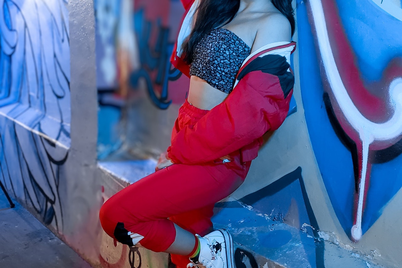 Dziewczyny noszą także dresowe spodnie do krótkich topów, odsłaniających brzuch – do tego dobierają sneakersy i jeansowe katany. Alternatywą może być także skórzana ramoneska albo koledżowa bomberka.